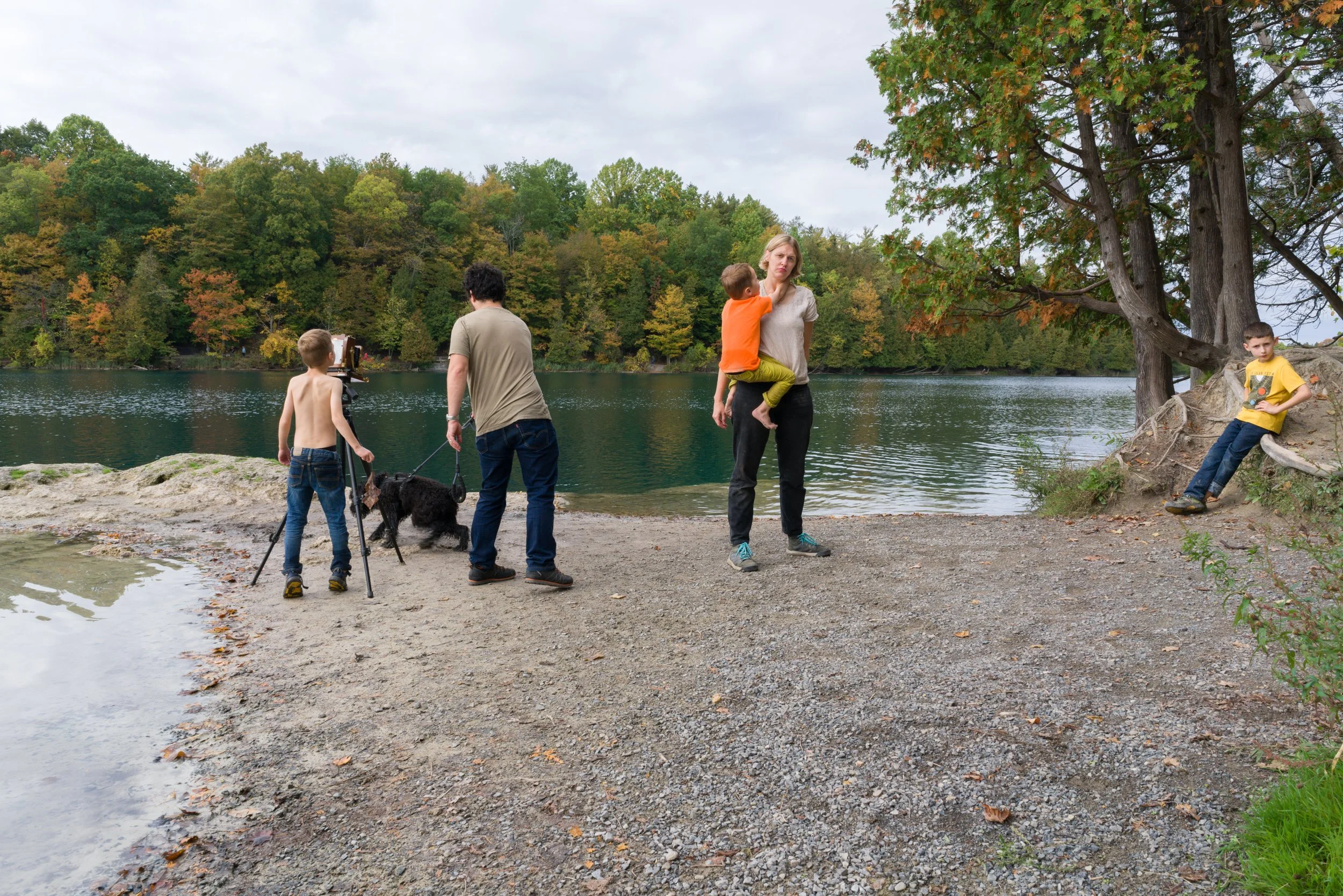 I started this series of family portraits to document my boredom watching my husband’s photographic process. As he photographed, I played off his position capturing our presence within the wider landscape. I set out to document the often invisible relationships that surround an artist. In this series, as our family has grown, our children have entered the frame complimenting and complicating the creative process. With water as the consistent backdrop, the photographs explore the evolving relationships between siblings, married artists, and parents.